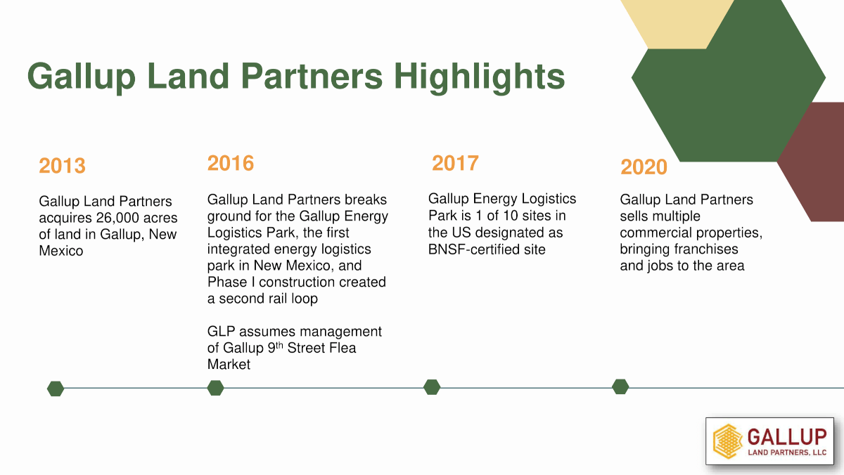 Since 2013, Gallup Land Partners has invested heavily in Gallup and McKinley County and been a valued partner in economic development in the region. That relationship continues today.