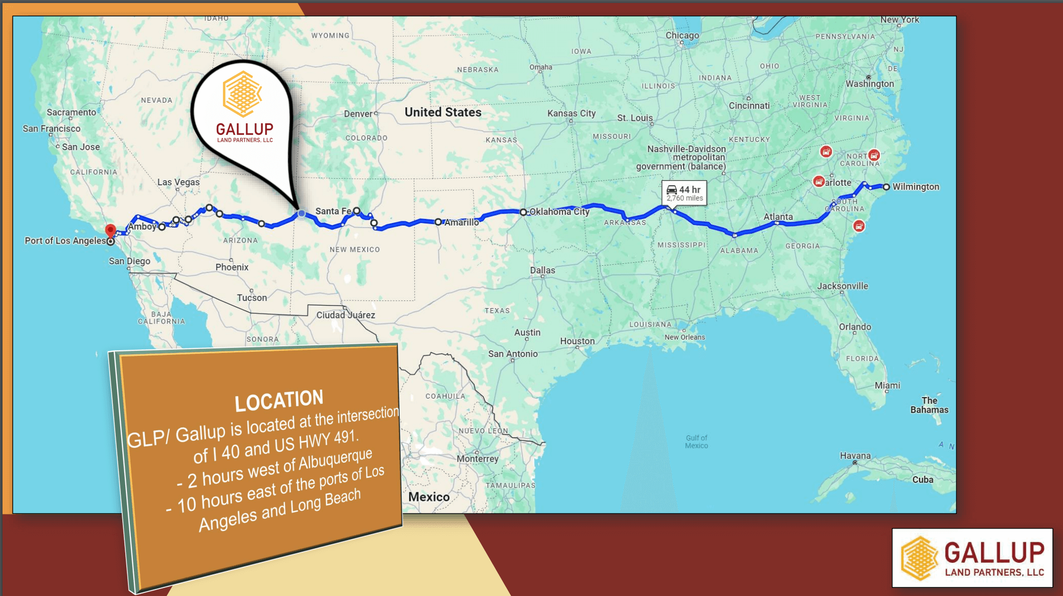 Gallup Land Partners is located at the intersection of I 40 and US Highway 491, two hours west of Albuquerque. Gallup, New Mexico, is ideally located within the 11-hour rule, where trucks coming from the ports of Los Angeles and Long Beach are required to stop.